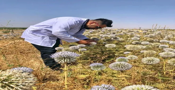 Suruç’ta Ziraat Mühendisi Mehmet Bilgin, bölgenin kurak iklimine dayanıklı Topuz dikeni (Echinops) bitkisini yerinde inceledi.